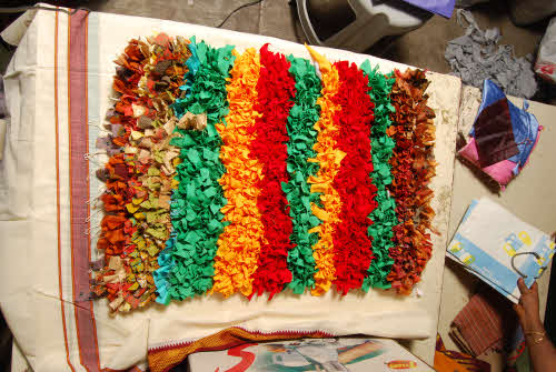 Along with weaving, our children also work on pile carpets and make them completely by hand, recycling old cloth.