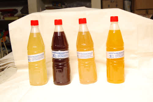 At the workshop, we make arecanut plates, juice bottles and fresh fruit-juice essence.